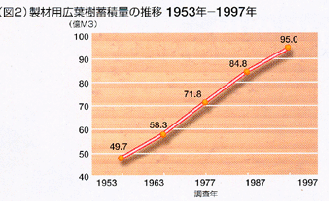 | ■ | 1953年以来、広葉樹の生長量は、伐採量を大きく上回っています。広葉樹林蓄積量は大きく増加し、1953年以来ほぼ2倍。91%増加しました。(図 2参照) |