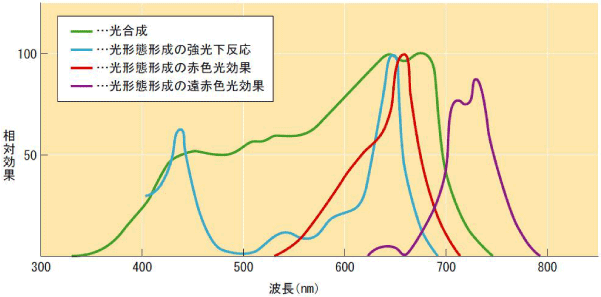 光合成に対しては赤色光の効果が大きく、葉の正常な形態形成には青色光が必要とされます。